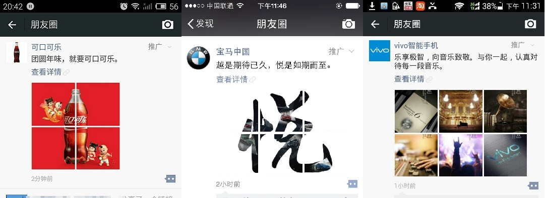 昨天微信朋友圈信息流广告首批上线,宝马中国、Vivo 智能手机和可口可乐的广告出现在每个人的朋友圈信息流里,但是每个人只有一个。所以瞬间全体微信用户被贴上了三个标签:刷出宝马广告的,刷出 vivo 广告的和刷出可口可乐广告的。 微信的朋友圈广告采用了在 Feed 信息流中内嵌,与正常的单条朋友圈完全一样,由文字和图片构成,点击之后进入广告的完整 H5 界面。用户可以点赞或者评论,还能看到自己的好友的点赞和评论。这能够让你看到自己的朋友中谁和自己看到了同样的广告,因此迅速引爆了朋友圈。 所以,昨天晚上的朋友圈变成了晒广告的海洋,还有各种借势营销。没有刷到宝马广告的人各种怨念,“我明明只喝加多宝,为什么推给我可口可乐”。 不知道习大大、马云和张小龙的微信朋友圈能刷到什么广告…… 因为信息流广告是根据用户的性别、年龄、偏好、消费记录、LBS 信息还有颜值(当我没说)打造用户的标签系统,用算法为每位用户个性化和精确的定制广告。所以刷到什么样的广告,在某种程度上意味着大数据对你消费能力和消费品味所下的一个结论。 目前微信和 QQ 已经触及到生活中的各个场景,腾讯所积累的数据非常庞杂。为什么你刷不到宝马的广告,可能有以下原因: